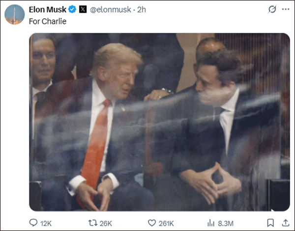 公開鬧翻幾個月后,美國總統(tǒng)特朗普與知名企業(yè)家馬斯克于9月21日在查理·柯克追悼會現(xiàn)場同框亮相,兩人相鄰而坐并握手交談。
